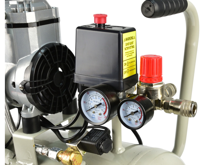 Компресор оснащений безмасляним насосом, придатним для тривалої роботи. Укомплектований манометром, який показує тиск в баку, і редуктором тиску з манометром, за допомогою якого можна встановити вихідний тиск і зчитати його.